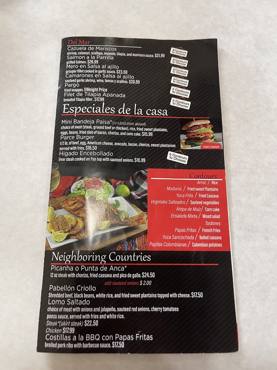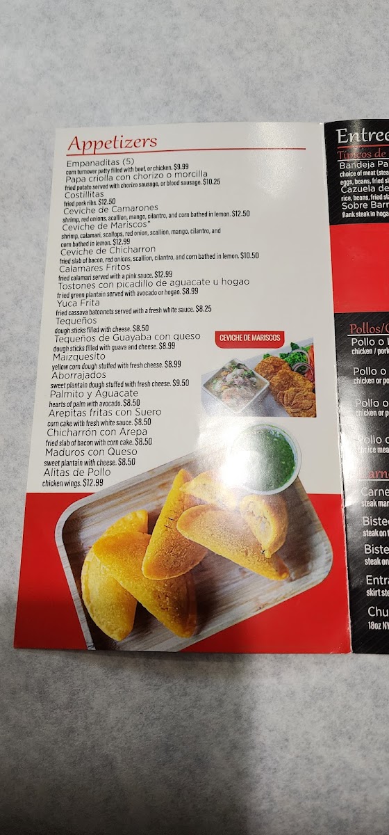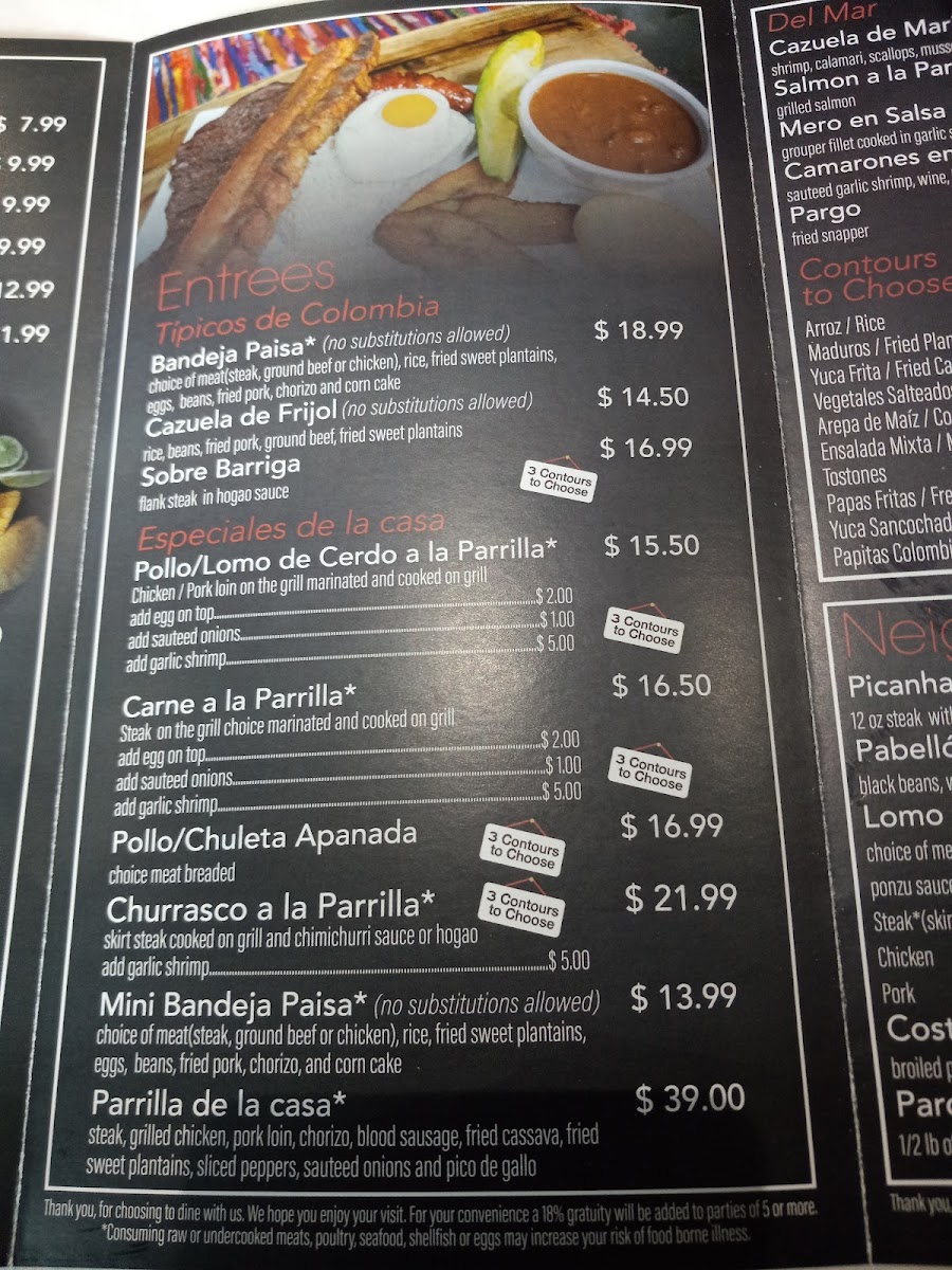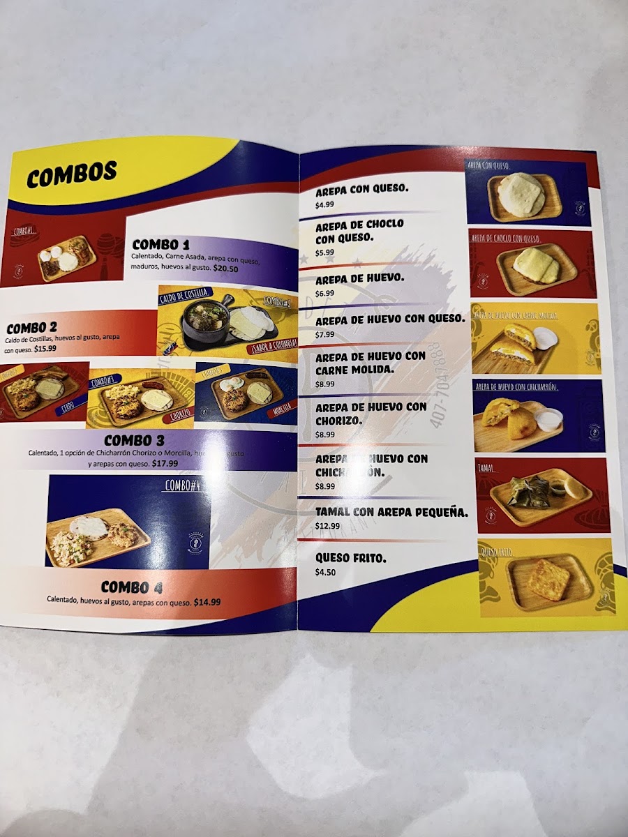Calentado, Carne Asada, Arepa con Queso, Maduros, Huevos al Gusto.