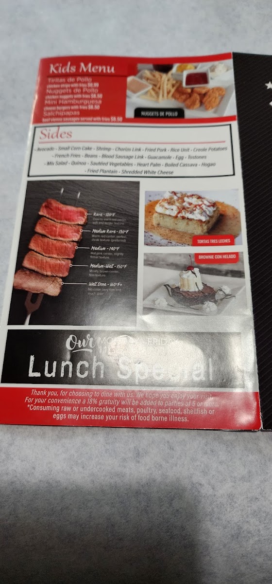 Choice of meat (Steak, ground beef or chicken) Rice, fried sweet plantains, eggs, beans, fried pork, chorizo and corn cake.